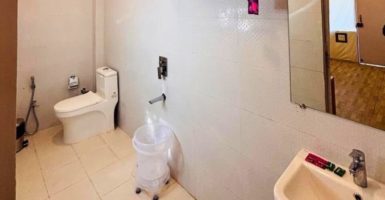 Nestled amidst beautiful gardens, our Swiss Tents are designed with a thoughtful layout, comprising three distinct areas. The first is a well-equipped washroom, ensuring your convenience and privacy. The second is a comfortable living room space, and the third is a private sitting area within the Swiss Tent, allowing you to immerse yourself in the serene surroundings.